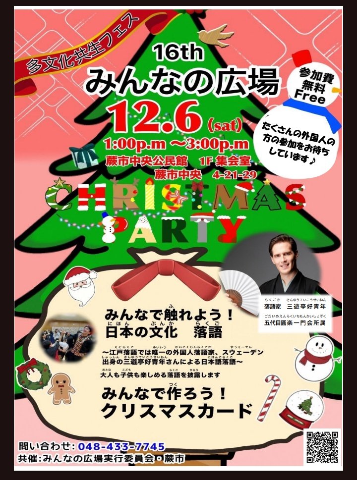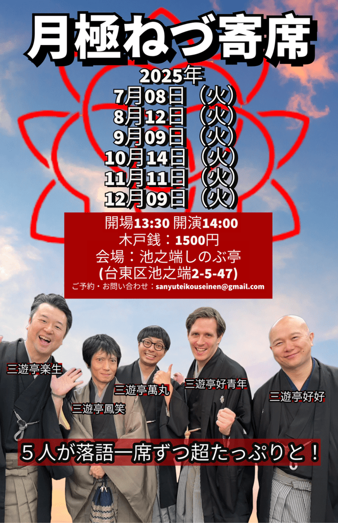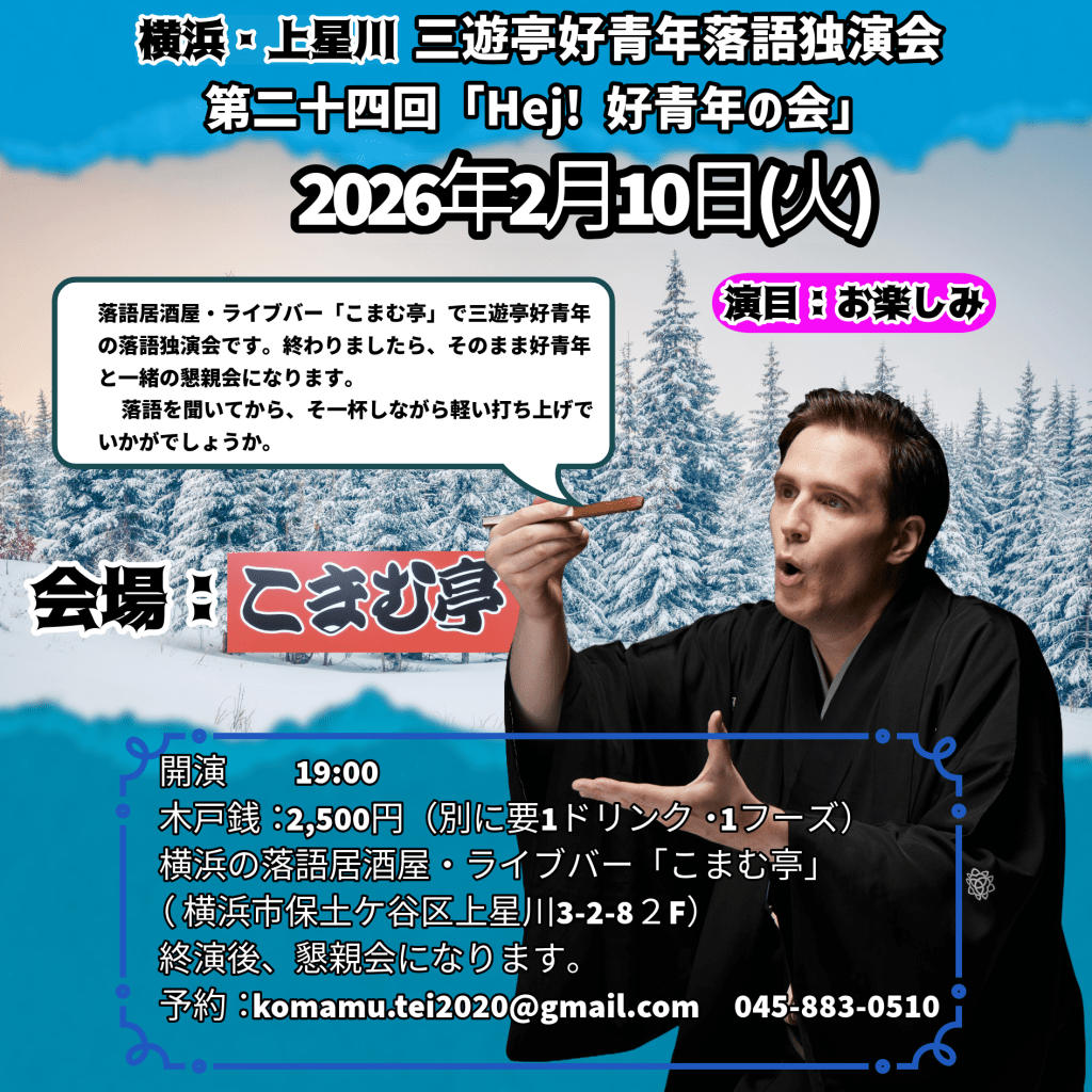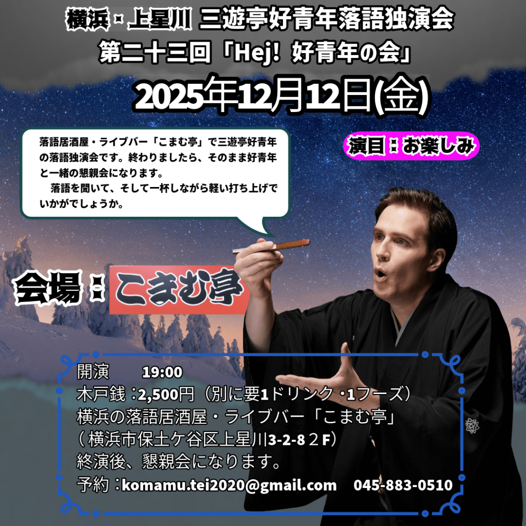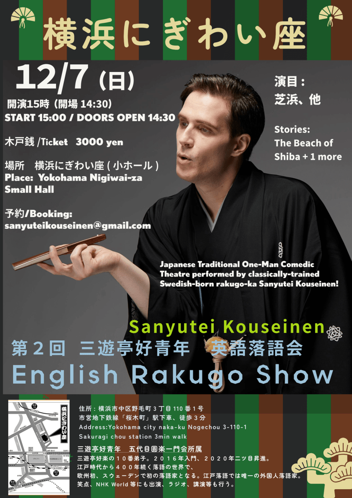 12月7日(日)横浜にぎわい座 三遊亭好青年英語落語会 Yokohama Nigiwai-za English Rakugo Show Venue: Yokohama Nigiwai-za (Near Yokohama station) Tickets: 3000 JPY (Paid at the venue) Doors open: 14:30 Show starts: 15:00 Ends:16:30〜 For booking: sanyuteikouseinen@gmail.com