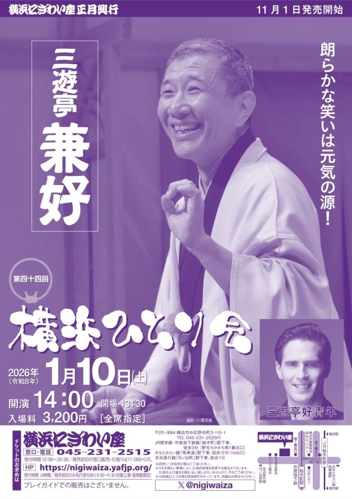1月10日(土)横浜にぎわい座 芸能ホール 「第四十四回 三遊亭兼好 横浜ひとり会」にゲスト出演 出演:三遊亭兼好、三遊亭好青年 14:00開演(13:30開場)