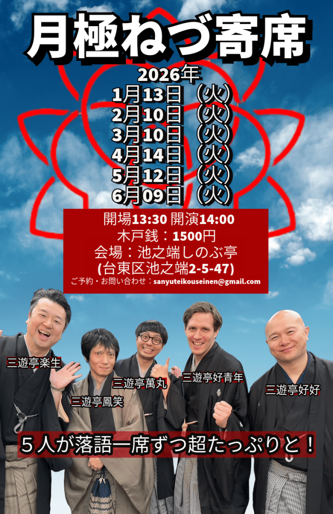 1月13日(火)月極ねづ寄席、会場:池之端しのぶ亭。開場13:30開演14:00出演者:三遊亭楽生、鳳笑、好好、萬丸、好青年。木戸銭:1500円