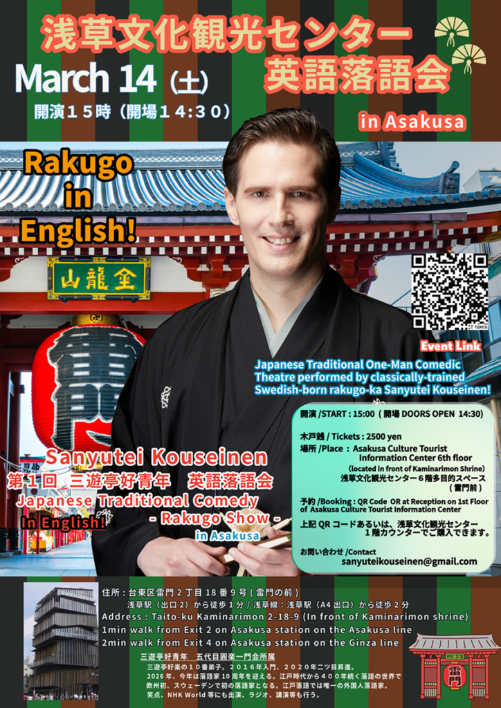 3月14日(土)浅草、英語落語会 1st Sanyutei Kouseinen English Rakugo Show in Asakusa