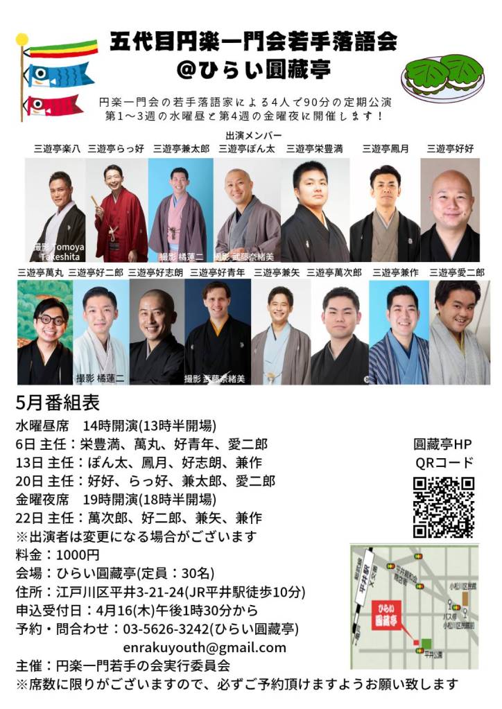 5月12日(火)月極ねづ寄席、会場:池之端しのぶ亭。開場13:30開演14:00出演者:三遊亭楽生、鳳笑、好好、萬丸、好青年。木戸銭:1500円
