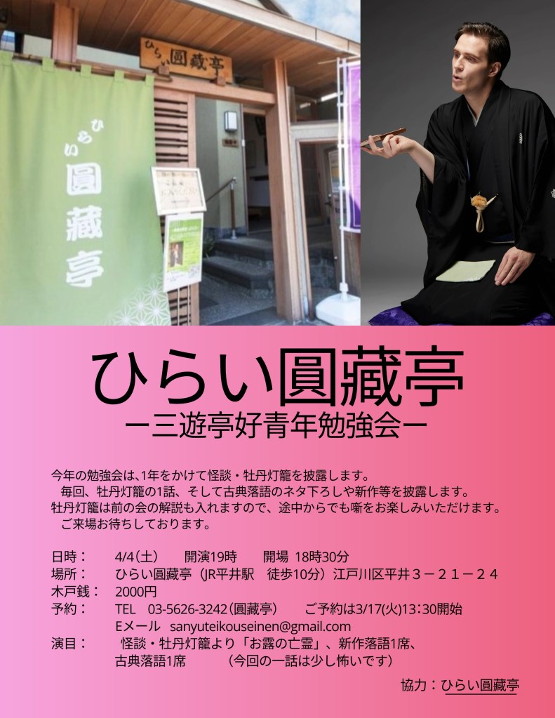 4月4日(土)ひらい圓藏亭 三遊亭好青年勉強会 開演: 19:00開場、18:30開演 場所 ひらい圓蔵亭 平井駅徒歩10分 江戸川区平井3-21-24 木戸銭 2000円 予約 ひらい圓蔵亭call 03-5626-3242 或いはEmail sanyuteikouseinen@gmail.com 演目:怪談牡丹灯籠より「お露の亡霊(少し怖い)」 、新作落語1席、古典落語1席