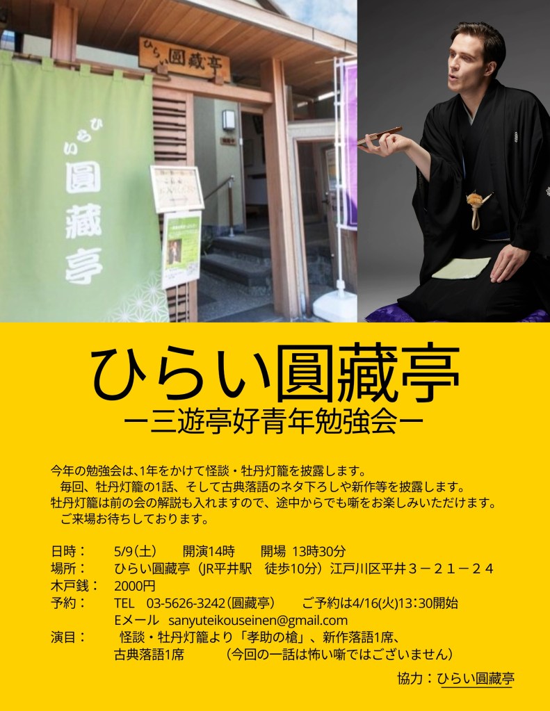 5月9日(土)ひらい圓藏亭 三遊亭好青年勉強会 開演: 19:00開場、18:30開演 場所 ひらい圓蔵亭 平井駅徒歩10分 江戸川区平井3-21-24 木戸銭 2000円 予約 ひらい圓蔵亭call 03-5626-3242 或いはEmail sanyuteikouseinen@gmail.com 演目:怪談牡丹灯籠より「孝助の槍(怖くない)」 、新作落語1席、古典落語1席
