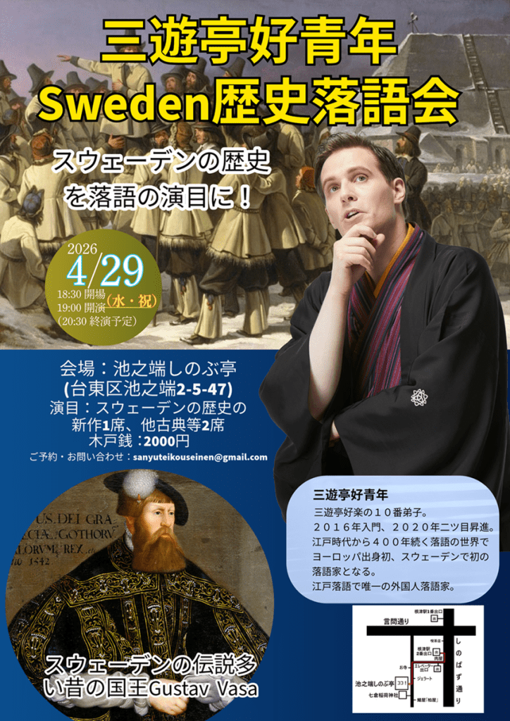4月29日(水・祝)池之端しのぶ亭、三遊亭好青年Sweden歴史落語会 開場18:30開演19:00 ご予約:sanyuteikouseinen@gmail.com