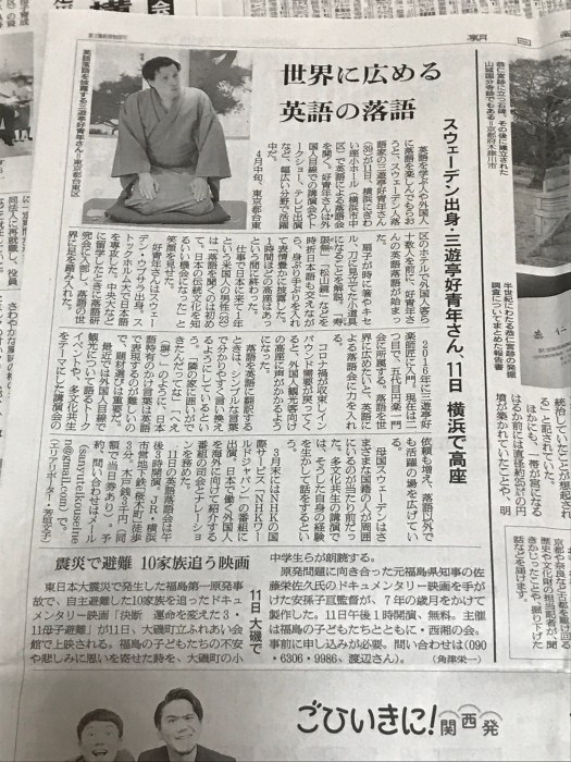 5月の横浜にぎわい座での英語落語会を、朝日新聞や毎日新聞で取り上げて頂きました。日本語での解説も交えながら、様々な語学レベルのお客様に合わせて英語落語を披露しております。