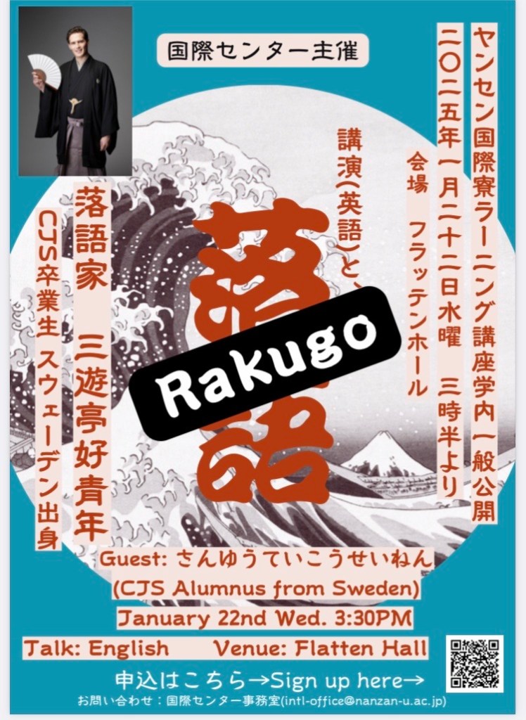 先日は、名古屋にある南山大学で、特別講演のご依頼を頂き、留学生、日本人学生、教職員の方を対象とした英語での講演と日本語での小噺も交えた英語落語を披露してきました。