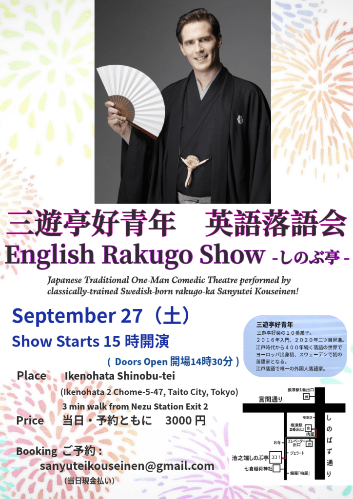 (English Rakugo Show is held in Ueno area ,Tokyo. If you have any questions, please send a message to the Sanyutei kouseinen Office, sanyuteikouseinen@gmail.com The Staff member will reply you soon. )