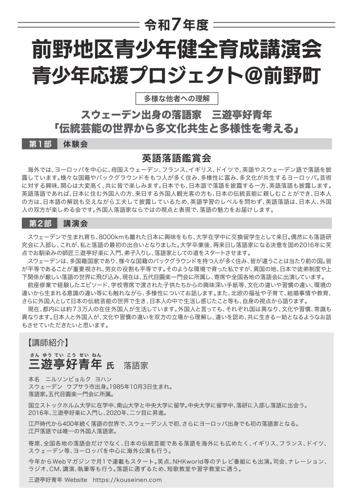 少年健全育成講演会」にて英語落語と講演を行いました。